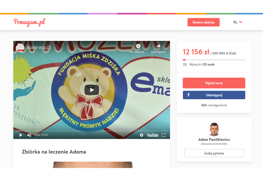Adam jest pod stałą opieką Świętokrzyskiego Centrum Onkologii w Kielcach. Przyjmuje chemię farmakologiczną, codziennie. Jego stan jest bardzo dobry i ma bardzo dobre rokowania. Adam konsultuje się również ze swoimi lekarzami, z którymi złapał kontakt podczas walki z Białaczką. Regularne badania, kontrole oraz wizyty, na których analizowany jest wdrożony plan leczenia, dają Adamowi szanse i pozwalają zachować kontorlę nad chorobą. Bardzo dziękujemy wszystkim, którzy tak chętnie pomagali i pomagają Adamowi! Adam cały czas walczy, cały czas się leczy i ŻYJE! Pozdrawia serdecznie wszystkich nie gadających tylko pomagających!